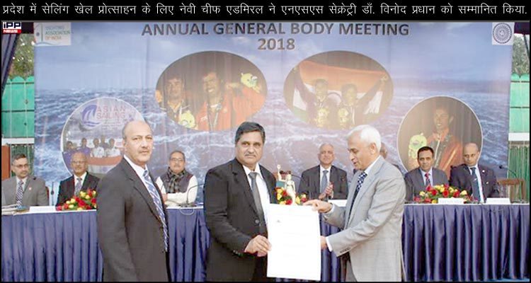 प्रदेश में सेलिंग खेल प्रोत्साहन के लिए नेवी चीफ एडमिरल ने एनएसएस सेक्रेट्री डाँ. विनोद प्रधान को सम्मानित किया